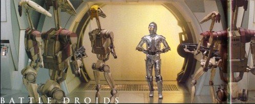 - The Federation transports (seen crashing thru the jungle in the trailer) open and racks of Battle Droids are pulled out and lined up by a squad of STAPs.