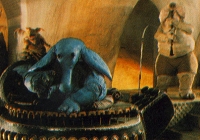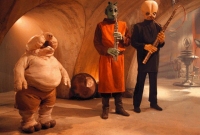 Well they are a jizz band, no not jazz band. Max Rebo is the guy on that keyboard, who looks like a blue elephant. Sy Snoothles is the singer, with the long nose, and long legs. Droopy McCool is not in the picture, and I'm sorry about that. Droopy plays a flute-like instrument. They were all originally in a band named Evar Orbus and His Galatic Jizz Wailers. Well that band no longer exists, because Orbus was killed. The band renamed themselves The Max Rebo Band, and Jabba The Hutt liked them. Jabba offered them a lifetime contract, and to pay them with food. Rebo, loving food agreed. One day the band was called on to play at the "exectution" of a Jedi (Leia) and a pair of smugglers. Well Jabba was killed, and their contract with him ended. Max Rebo is still looking to play elsewhere. |